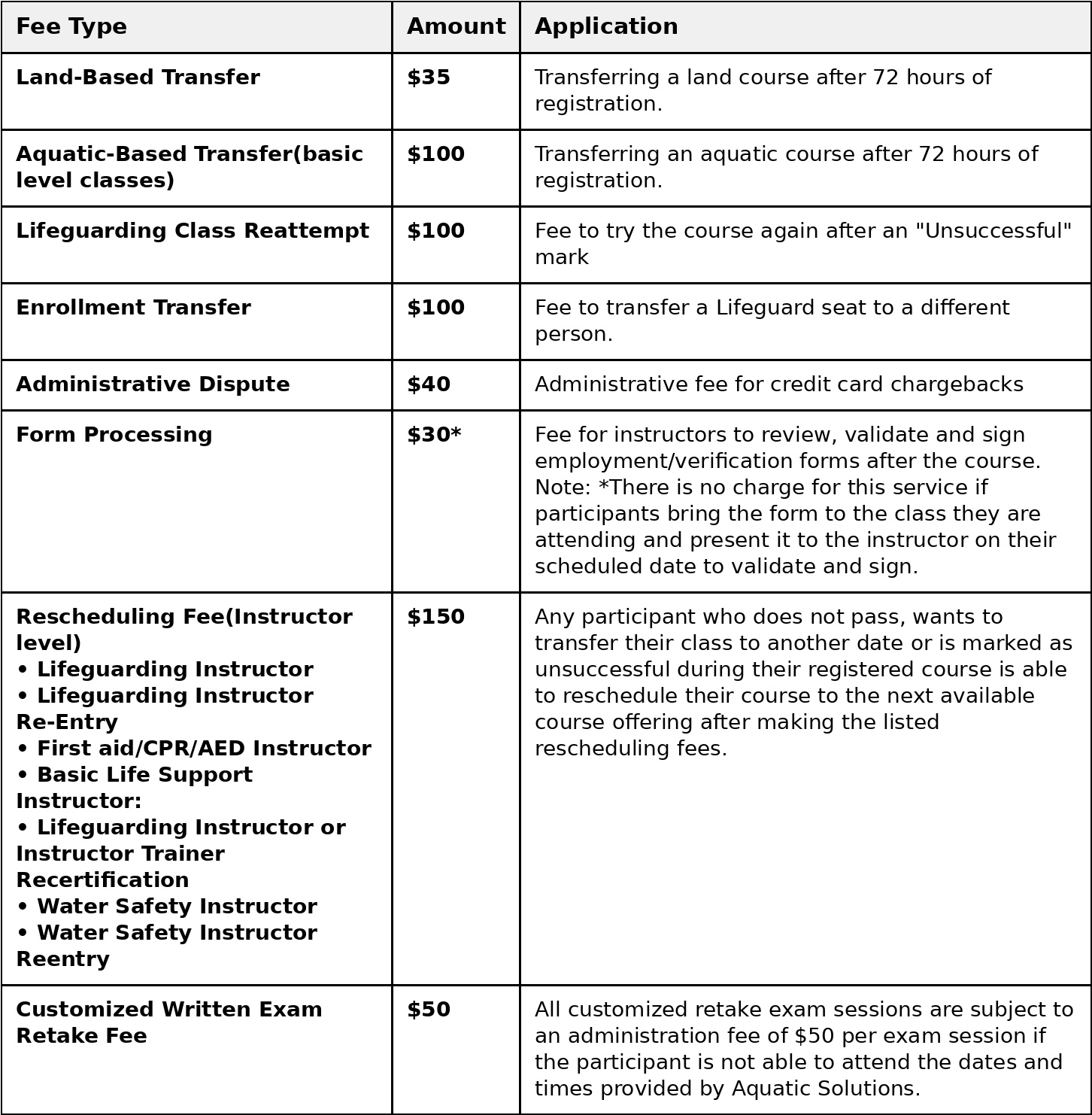 In the event the participant is marked as unsuccessful in the course for any reason: a $100 reattempt fee would apply for an additional reattempt of the course at the next available offering with a credit valid for four(4) months from your originally scheduled course. Failure to do so will result in forfeiture of enrollment fees. There is no refund given once a grade of Unsuccessful is issued. To reattempt the class and make the $100 reattempt fee an email must be sent to help@aquaticsolutions-cpr.com After the reattempt fee is made an Aquatic Solutions representative will respond with the next available offerings for the reattempt.